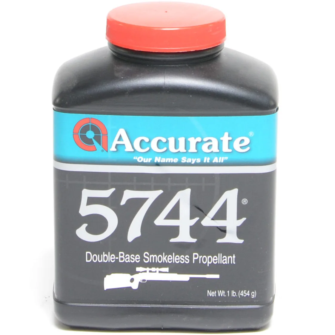 Accurate 5744 smokeless powder is an extremely fast burning, double-base, extruded powder. This unique powder can be used in a wide range of rifle calibers and magnum handguns. 5744 reloading powder is characterized by excellent ignition and consistency over a very wide performance range. Low bulky density and superior ignition characteristics make 5744 an excellent choice for reduced loads in many rifle calibers and in large capacity black powder cartridges such as the 45-70 through 45-120 and 50-90 through 50-120.