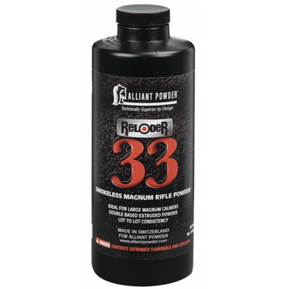 Alliant Reloder 33 smokeless magnum rifle powder was originally designed for the long-range .338 Lapua but has since been a great choice for a variety of large magnum caliber rifles. This double based extruded powder offers superior lot to lot consistency. Reloder 33 comes in 1lb and 8lb canister sizes.