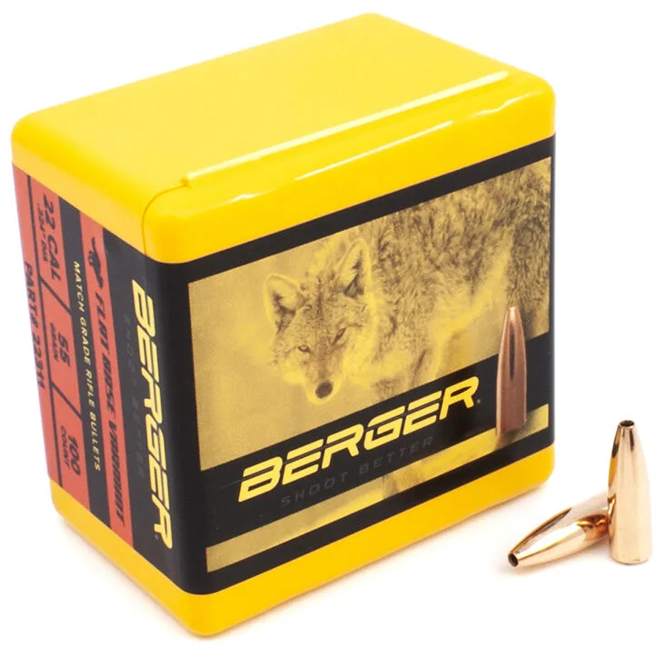 Berger Varmint Bullets feature Match Grade quality construction and have a large hollow point that produces rapid expansion when used for varmint hunting. Each bullet is made with thin nosed J4 Precision Jackets which are renowned by competitive target shooters and custom bullet makers worldwide. Berger Varmint Bullets use a tangent ogive design making these easy to load, tune, and shoot accurately. J4 Precision Jackets have a Total Indicated Runout (TIR) of +/- .0001 and extremely tight manufacturing tolerances. Berger Varmint Bullets provide match-quality construction and accuracy, increasing your hit percentage and extending your effective lethal range. ?