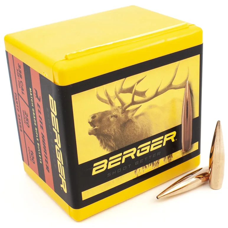 Hunters choose Berger .338 / 338 250 grain elite hunter rifle bullet because of its rapid expansion that takes down most game immediately. This Berger bullet is designed to optimize efficiency, minimize seating depth sensitivity, reduce wind-drift and maximize your hunting experience.
