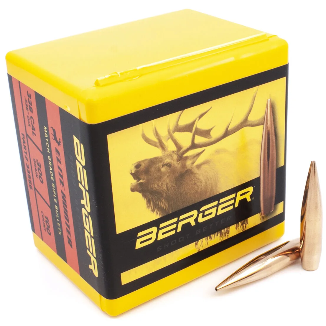Berger .338 / 338 300 grain elite hunter is the ideal hunting rifle bullet with its hybrid ogive design and J4 precision jacket. This product from Berger Bullets boasts reduced-wind drift, optimal efficiency and minimized sensitivity to seating depth. The design of the bullet allows it to expand and cause hydrostatic shock upon impact which makes it a top choice as a hunting rifle bullet.
