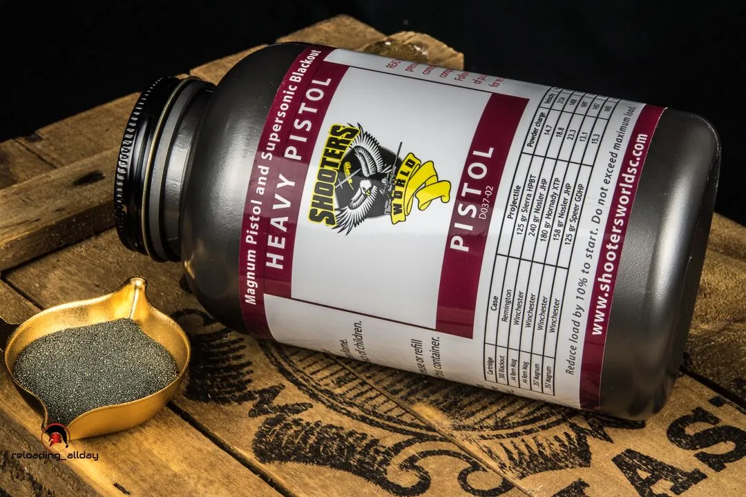 Shooters World Heavy Pistol Powder is appropriate for magnum pistol applications, 300 Blackout with lightweight projectiles and some other specialty ammunition. It is similar in burn speed to Accurate No 9®, and has similar application as Alliant 2400, Hodgdon H110 or Winchester 296.